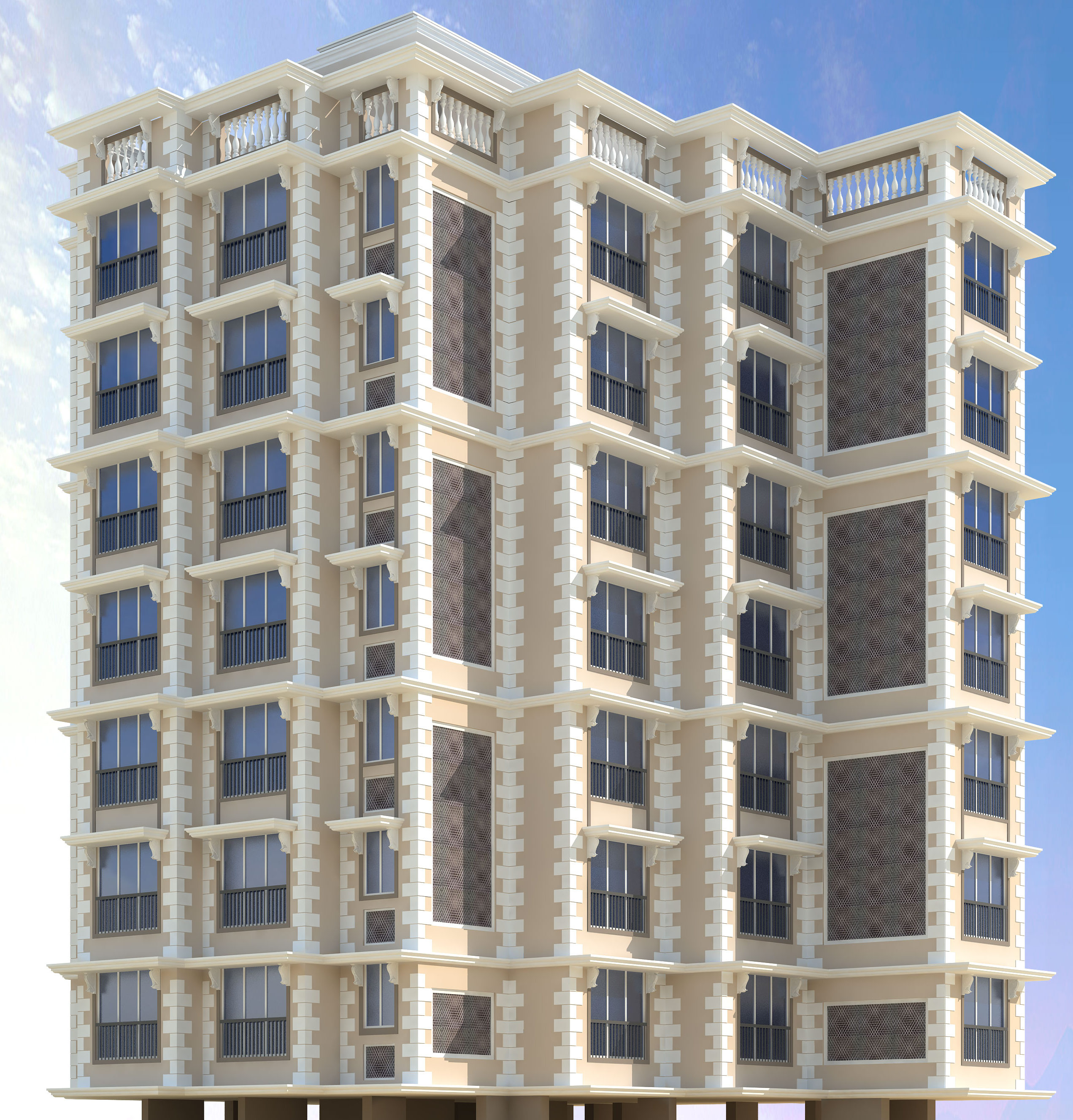 Redeveloped to be an iconic building with plans as per vaastu and elevation featuring the brick patterns at the corners depicting the robustness of the structure.
